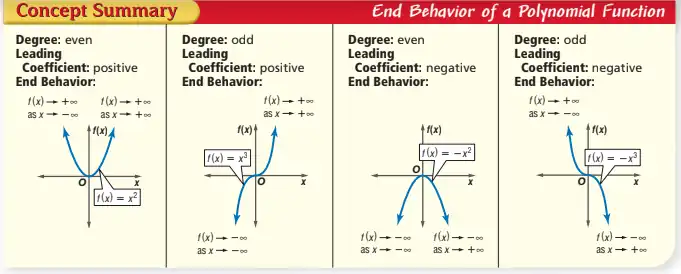 Observe the end behavior. Which direction does x or f(x) lead to? Positive or negative infinity (take note that the functions go infinity and never stop at a certain point)? This is represented by x→+∞ and x→−∞ (x-approaching positive infinity and x-approaching negative infinity, respectively). The degree and leading coefficient of a polynomial function determine the end behavior of the polynomial function graph. See Varsity Tutors - End Behavior of a Function (examples) for more examples of end behavior of functions.