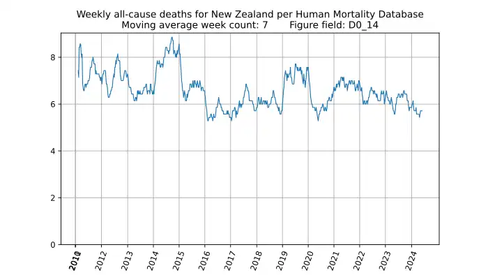 Weekly all-cause deaths in New Zealand for 0-14 year olds, based on mortality.org data, stmf.csv[2], 7-week moving average: