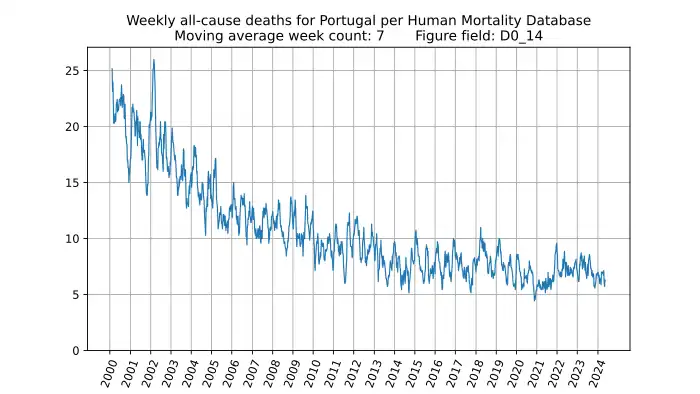 Weekly all-cause deaths in Portugal for 0-14 year olds, based on mortality.org data, stmf.csv[2], 7-week moving average: