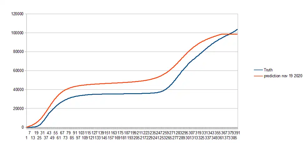 Stubborn model. Doesn't want to recognize any human intervention at all. Also, the more data I throw at it, the more it start to ignore the first peak of data. I think I might be measuring the improvement in treatments ? I might be back in a few days with yet another dimension to the model.