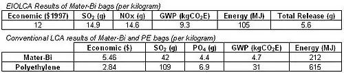 The indirect cost of Mater-Bi bags is based upon its benefit compared to polyethylene bags during its end of life. The health, air pollution and environmental cost of each non-biodegradable bag represented by the external costs of SO2, NOx, PO4, global warming potential and other releases is accounted for in levies. The environmental cost is estimated to be 10 cents per bag based on levies ranging from 15 cents in Ireland to 5 cents for purchases at furniture retailer IKEA. The indirect cost benefit from the levy saved is $372 million USD which is greater than the direct cost of $291 million USD for the annual consumption in Canada.