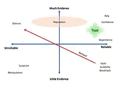 Several terms are related to trust in various ways. It is helpful to review the definitions of related terms and understand the distinctions and relationships. Each of the terms defined below are plotted on the reliability / evidence grid at the right.