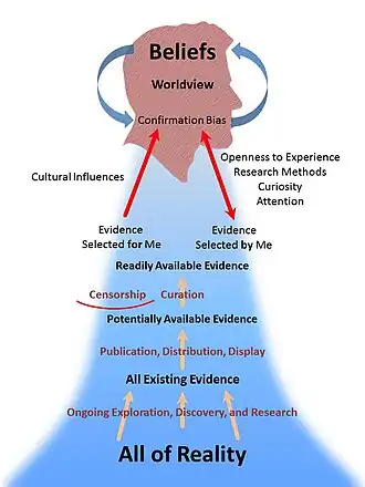 A recursive or positive feedback loop exists between our current beliefs and our confirmation biases that creates and sustains our worldview. In the absence of a worldview and confirmation bias, our current beliefs would be based heavily, if not entirely, on the most recent, relevant, and reliable evidence we have been exposed to. However our beliefs accumulate over time to form our worldview. At the same time our worldview is influencing how we interpret each new piece of evidence. Our beliefs and worldviews inform our confirmation bias, which selects, ignores, emphasizes, discounts, and interprets each new piece of evidence in ways that tend to confirm our existing beliefs.