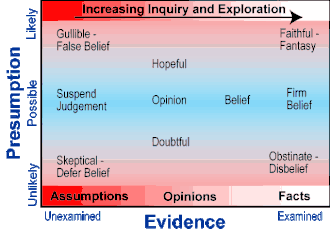 The most authentic path is the blue region across the center of the diagram. Beginning on the left, a new idea is proposed, and we begin with the neutral presumption that it is possible. We suspend judgment and even resist forming an opinion until we can gather more facts. As we begin to ask questions and explore the evidence, we learn enough to begin to form an opinion—a preliminary or tentative belief. If the evidence is scarce, ambiguous, or contradictory we may not be able to gather enough support for or against the idea to confirm a particular belief. If the evidence is clear for one position or the other, we can form a belief, and perhaps even a firm belief. Along this path you are diligent, you know what you know and how you know it. This path applies your well-founded theory of knowledge and leads toward wisdom.