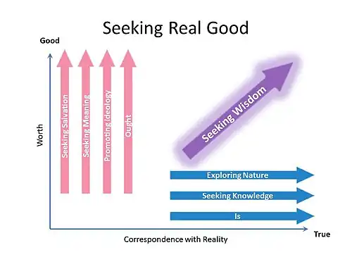 We must recognize that neither complete correspondence to reality nor absolute good can be achieved. It is best to consider pursuit of these elusive goals as an ongoing quest. The blue arrow indicates the direction of that quest, but not its end. Evaluating evidence, critical inquiry, seeking true beliefs, and scientific investigations assess correspondence with reality. I offer a tentative description of good and welcome your participation in improving that characterization.