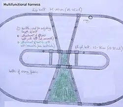 A climbing harness is also included. This for safety when crossing elevations, aswell as for securing in vehicles, ...