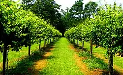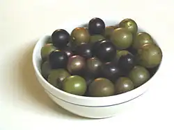 Scuppernongs are a particular type of large green grape that grow in the southern states. In the bottom picture the large green grapes are scuppernongs.