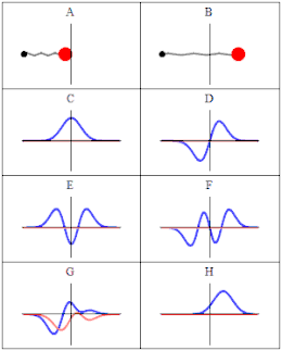 To the left are some computer generated solutions Schrödinger's equations for a (very tiny) mass attached to a spring. The symbol, ψ, is spelled psi, but often pronounced "sigh", with a hint of "p" at the beginning. It can also be pronounced "psee". It is called the "wavefunction", and is essentially the "amplitude", analogous to the "height" of the wave. The wavefunctions C through F represent states of known energy not unlike the "allowed" orbits of the Bohr atom. Wavefunctions G and H are more complicated and have no counterpart in Bohr's model of "allowed" states. They are known as "mixed energy" states.