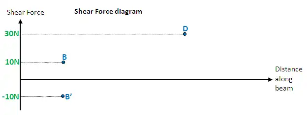 Shear force at B = 10N - 20N = -10N