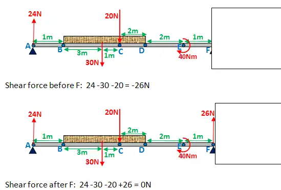 As you would have noticed when working out the bending moment and shear force at any given point, sometimes you just work it out at the point, and sometimes you work it out just before and after. Here is a summary: When drawing a shear force diagram, if you are dealing with a point force (points A,C and F in the above diagram), work out the shear force before and after the point. Otherwise (for points B and D), just work it out right at that point. When drawing a bending moment diagram, if you are dealing with a point moment (point E), work out the bending moment before and after the point. Otherwise (for points A,B,C,D, and F), work out the bending moment at the point.