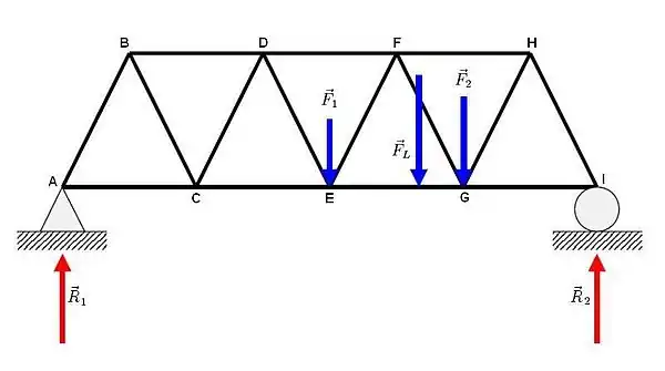 If the truss shown here were to need analysis for the internal forces on one particular member, EF, the method of sections could be used. Here we use the previous values for and . Also assume that each member is meters long.