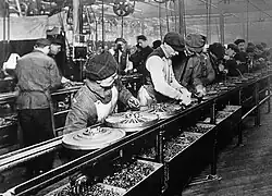 Ford figured out how to build cars inexpensively. In his factory, he used a moving assembly line. At first, Ford Motor Company produced only one type of car, called the Model T. The cars were put together while moving past a line of workers. Each worker would do one specific, simple job. Then, the car moved on to the next worker. The asssembly line made production fast and efficient. At the Ford plant, a finished car rolled off the assembly line every 10 seconds!