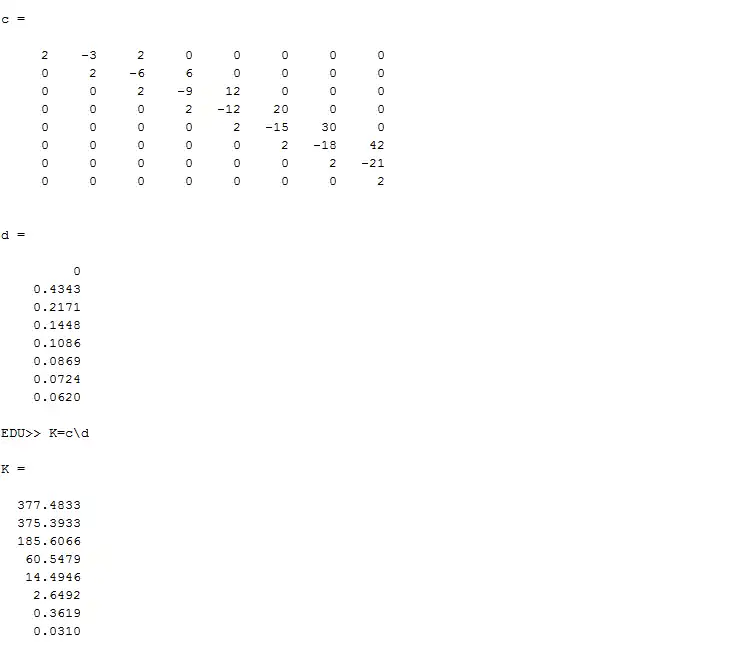 Plugging these values into the ODE and equating them to the excitation, and then solving them by using an upper triangular matrix as before (just as in the n=3 example) in Matlab: