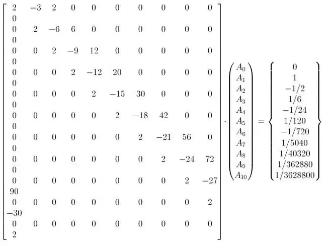 {\displaystyle \displaystyle {\begin{bmatrix}2&-3&2&0&0&0&0\\0&2&-6&6&0&0&0\\0&0&2&-9&12&0&0\\0&0&0&2&-12&20&0\\0&0&0&0&2&-15&30\\0&0&0&0&0&2&-18\\0&0&0&0&0&0&2\\\end{bmatrix}}\cdot {\begin{pmatrix}{A}_{0}\\{A}_{1}\\{A}_{2}\\{A}_{3}\\{A}_{4}\\{A}_{5}\\{A}_{6}\end{pmatrix}}={\begin{Bmatrix}0\\1\\-1/2\\1/3\\-1/4\\1/5\\-1/6\end{Bmatrix}}}