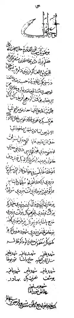 - ↑ 93.0 93.1 93.2 93.3 93.4 93.5 93.6 93.7 Öztuna, Yılmaz (1988). Mawsūʻat tārīkh al-Imbarāṭūrīyah al-ʻUthmānīyah al-siyāsī wa-al-ʻaskarī wa-al-ḥaḍārī (in Arabic). Vol. I (Frist ed.). Istanbul: Faisal Finance Institution. pp. 94 -96. https://ia801904.us.archive.org/17/items/waq76579/01_76579.pdf.